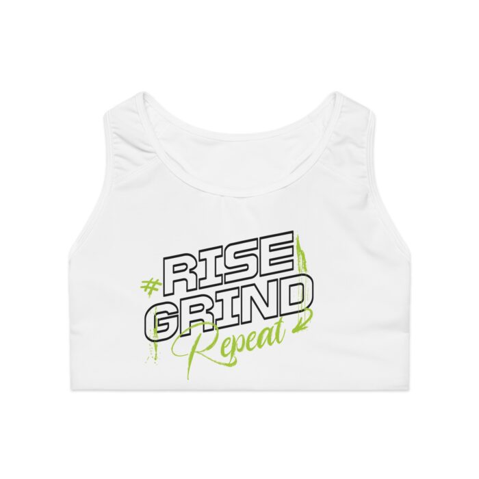 Motivational Sports Bra Rise Grind Repeat White